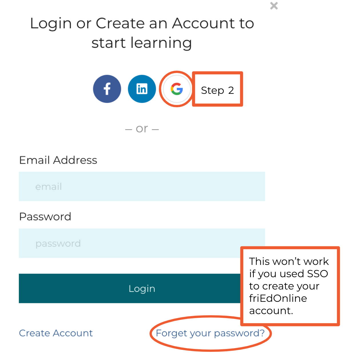 Most likely if you've clicked Forgot My Password and nothing happens, you probably used single sign-on, SSO, to create or authenticate your friEdOnline account.